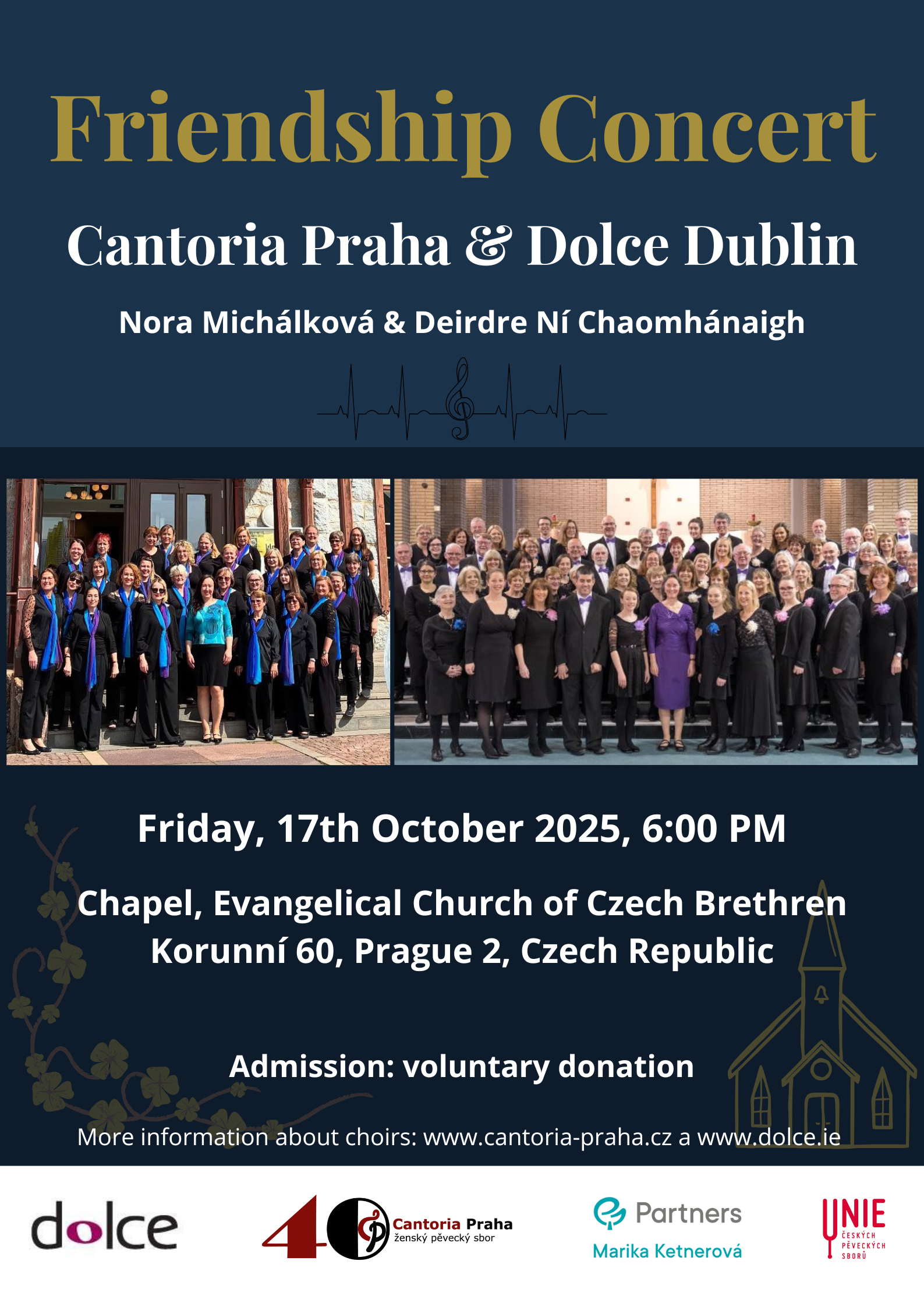 We invite you all to a concert of our choir Cantoria Praha and our dear guests choir Dolce Dublin, who will come all the way from Ireland to sing with us. You will have a unique opportunity to listen to the Dolce Dublin choir on Friday, October 17th from 6:00 PM in the chapel of the Evangelical Church of Czech Brethren in Vinohrady.