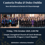 Cantoria Praha invites you to a Sacred Music Concert at the Svatyně Krista Krále, Kolbenova 658/14, Prague 9. The date of the event is Thursday, November 6, 2025 at 6:30 p.m. The concert will be conducted by choirmaster Mgr. Nora Michálková and accompanied on the piano by Petra Pachovská. Admission is voluntary.