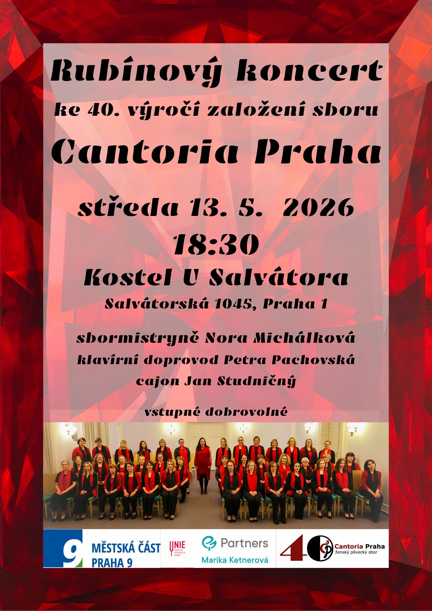 Cantoria Praha si vás dovoluje pozvat na náš Rubínový koncert ke 40. výročí založení sboru. Koncert se bude konat ve středu 13. 5. 2026 v 18:30 v kostele u Salvátora, Salvátorská 1045, Praha 1.
